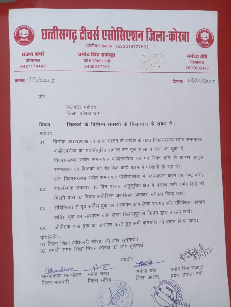 कोरबा – छ.ग.टीचर्स एसोसिएशन के प्रतिनिधि मंडल ने कलेक्टर से मुलाकात कर शिक्षकों के विभिन्न समस्याओं से अवगत कराते हुए ज्ञापन सौंपा गया जिस पर कलेक्टर महोदय ने शीघ्रता से ठोस निर्णय लेने का प्रतिनिधि मंडल को आश्वासन दिया गया।छत्तीसगढ़ टीचर्स एसोसिएशन के जिला अध्यक्ष मनोज चौबे ने प्रेस विज्ञप्ति जारी कर बताया कि पोड़ी उपरोड़ा ब्लाक में विकास खंड स्त्रोत समन्वयक के पद रिक्त पद पर शीघ्र नियुक्ति करने,अनुसूचित क्षेत्र में पदस्थ सभी कर्मचारियों को 13 दिन की आकस्मिक अवकाश के अतिरिक्त 7 दिन की आकस्मिक अवकाश कुल 20 दिन की आकस्मिक अवकाश स्वीकृत करने,क्षेत्रीय कार्यालय छत्तीसगढ़ राज्य संपरीक्षा रायगढ़ और बिलासपुर से सेवा पुस्तिका का सत्यापन विभाग द्वारा कराए जाने,सभी शिक्षकों का जीपीएफ पासबुक संधारण करते हुए सभी कर्मचारियों को पासबुक प्रदान करने सहित शिक्षक हितार्थ में आदेश जारी करने कलेक्टर को ज्ञापन सौपा गया है ।जिस पर कलेक्टर महोदय ने सभी विषयों पर सकारात्मक चर्चा करते हुए पोड़ी उपरोड़ा विकासखंड स्त्रोत समन्वयक की नियुक्ति आदेश शीघ्र जारी करने संघ के प्रतिनिधि मंडल को आश्वासन दिया गया।